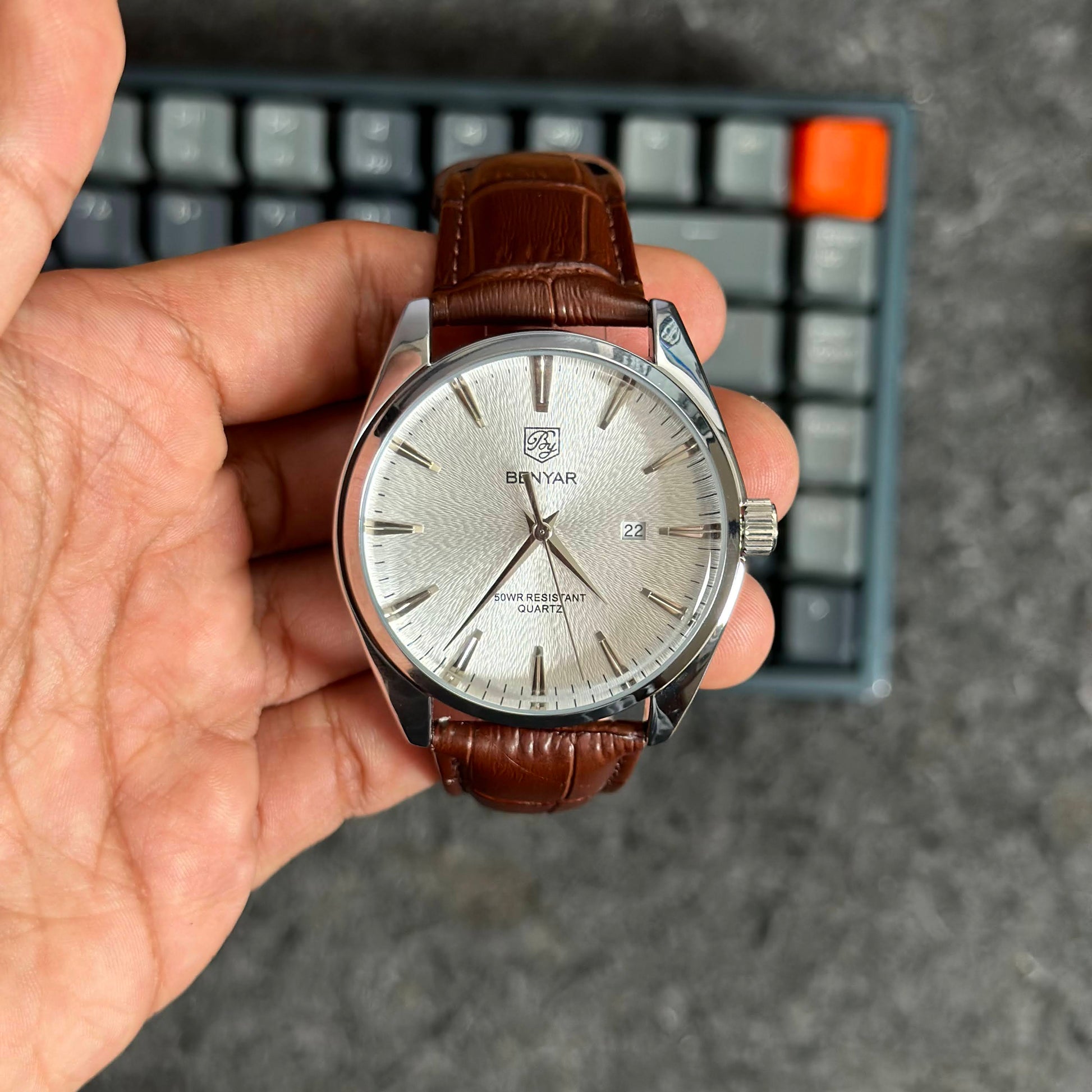 La verdadera sofisticación no necesita adornos. El Reloj Benyar 5163 es la quintaesencia del reloj de vestir clásico, diseñado para el hombre que aprecia la elegancia pura y un diseño impecable. Su característica más notable es la esfera plateada con una sutil textura ondulada, que crea un efecto visual refinado y lujoso. Combinado con una correa de cuero PU con acabado tipo cocodrilo, este reloj es el accesorio perfecto para un look profesional o una ocasión especial.