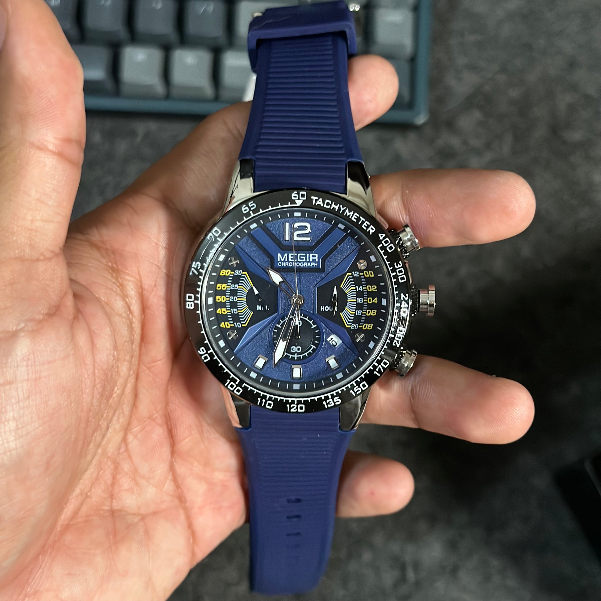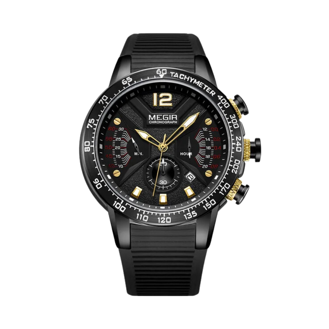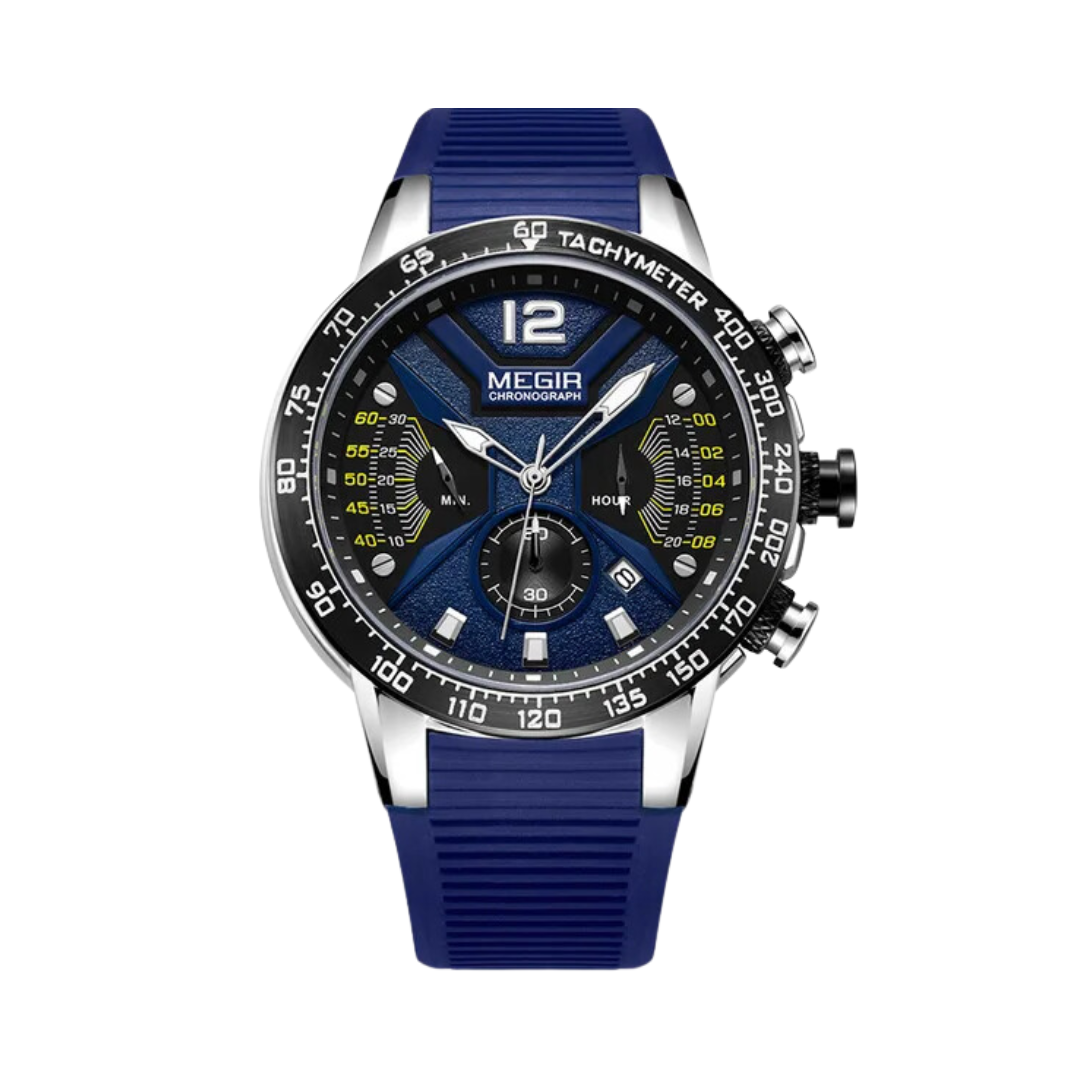 Diseñado para el hombre que vive con pasión y precisión, el Reloj Megir 2106 es pura energía inspirada en el mundo del automovilismo. Su esfera de alto contraste, con detalles y sub-diales que recuerdan a los velocímetros de un auto de carreras, no solo luce espectacular, sino que ofrece una legibilidad perfecta. La robusta caja de acero se combina con una correa de silicona de alto rendimiento, creando un reloj tan cómodo como imponente, listo para acompañarte en cada curva del camino.