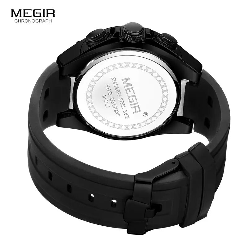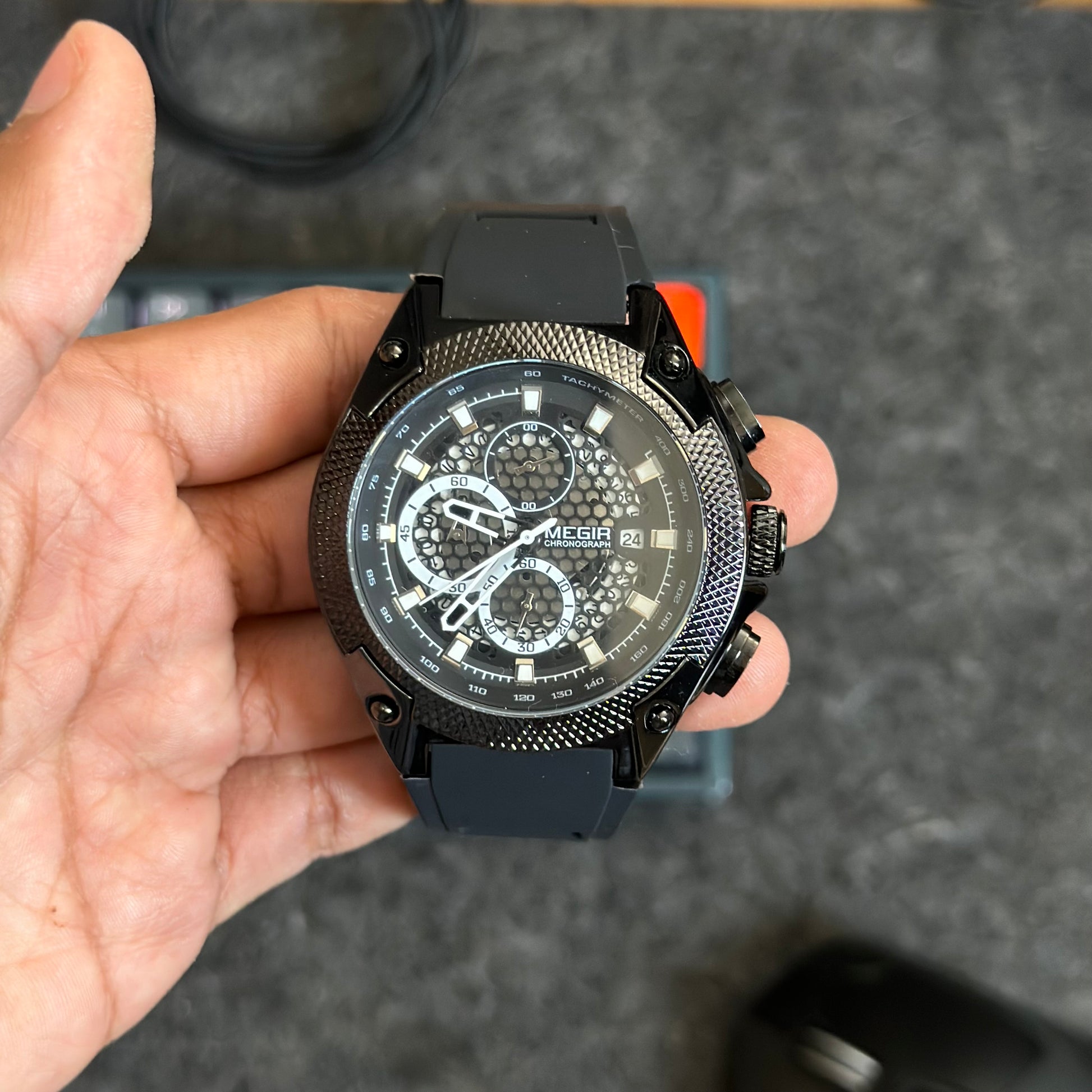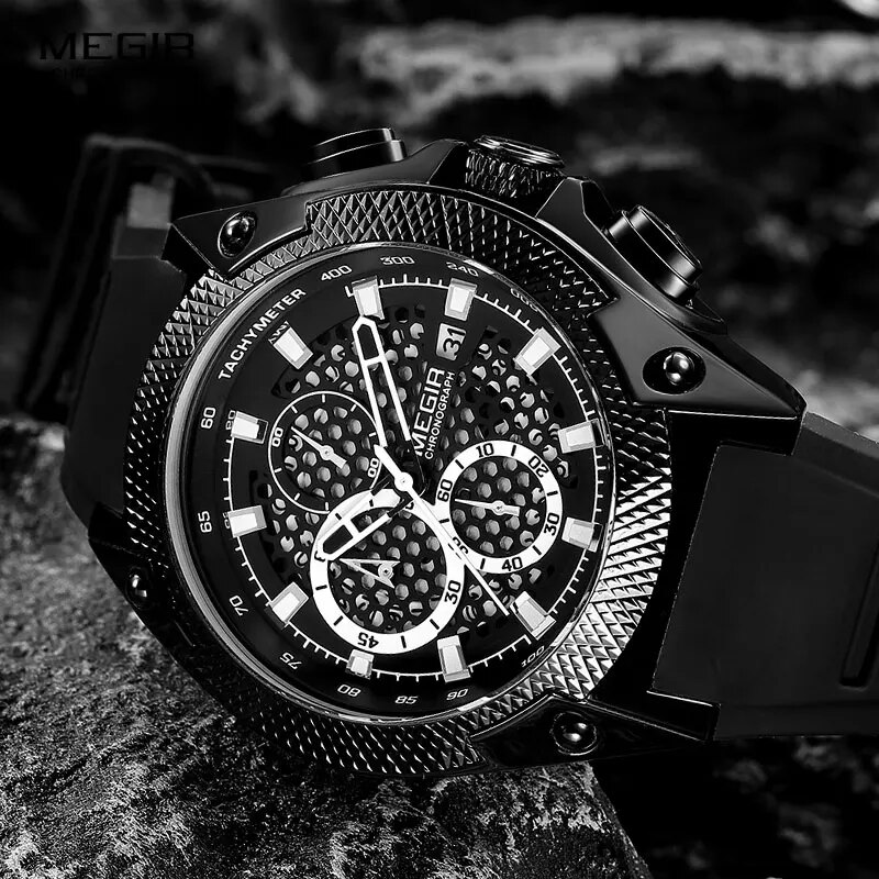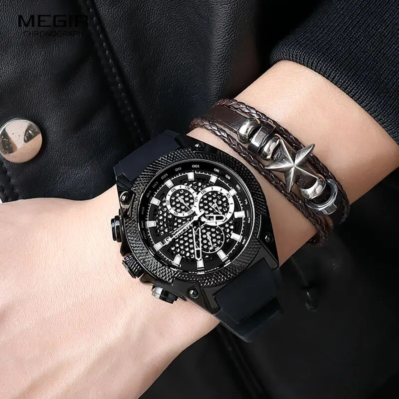 Para el hombre que se mueve con confianza por la jungla urbana. El Reloj Megir 2127G es una pieza de diseño táctico y moderno, con un imponente acabado "todo negro" que proyecta una imagen de fuerza y determinación. Su esfera, con una textura tipo "panal de abeja" y sub-diales de alta legibilidad, está diseñada para el rendimiento. La robusta caja de acero se integra perfectamente con una cómoda correa de silicona, creando un reloj que está listo para cualquier misión que tu día te depare.