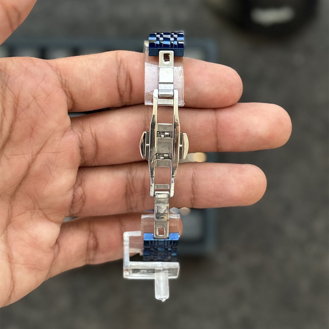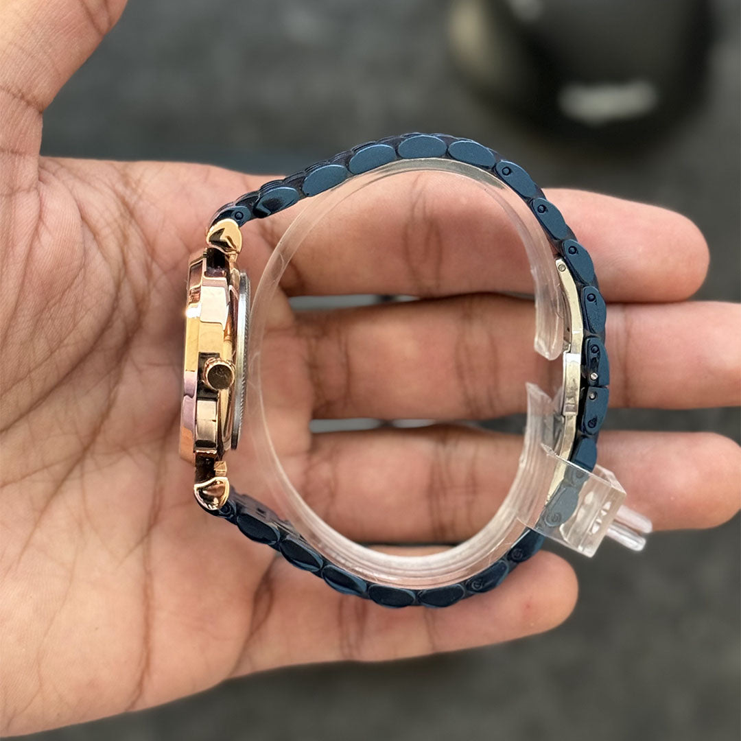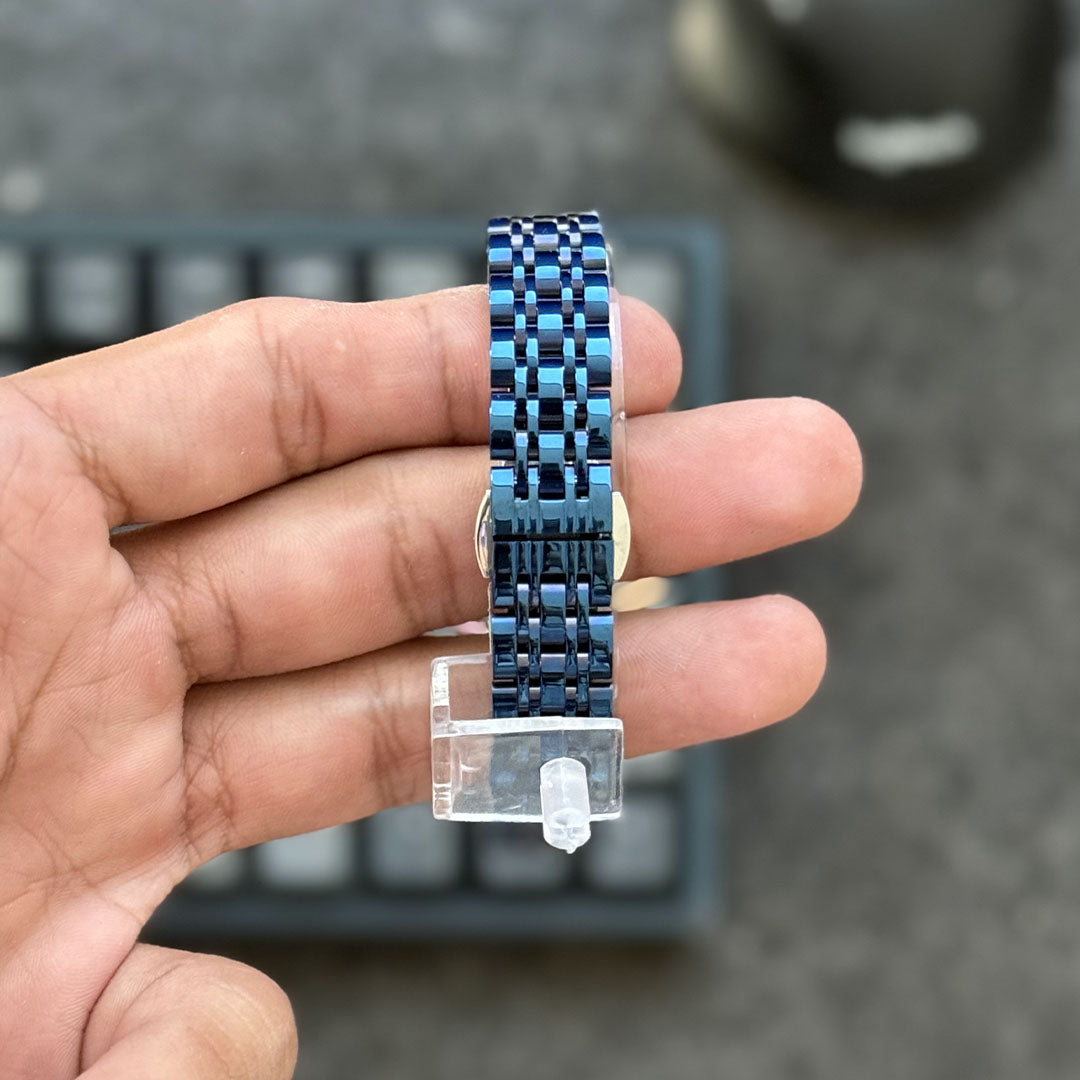✓ Combinación de Colores Única: El contraste entre el azul intenso y el oro rosa es una declaración de moda que te diferenciará, añadiendo un toque de color y lujo a cualquier atuendo.