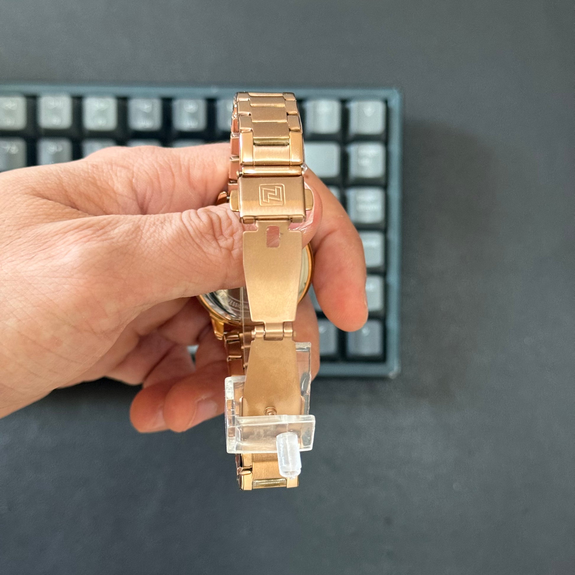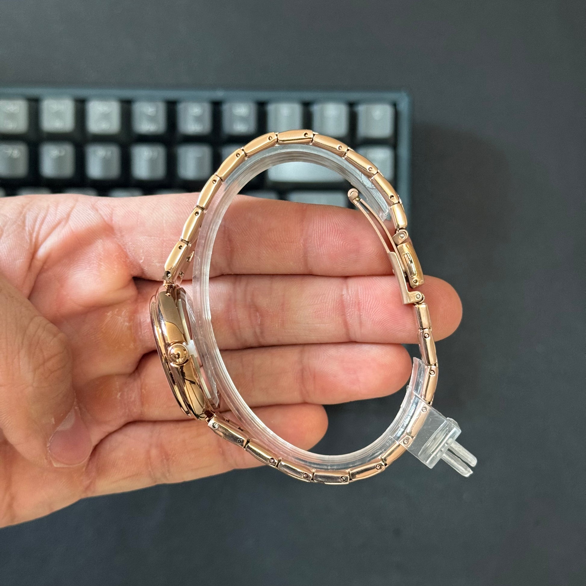 La robusta caja y el brazalete de acero inoxidable, bañados en el mismo tono oro rosa, no solo garantizan durabilidad, sino que también aportan un look de lujo y distinción. Es el accesorio perfecto que te acompaña con la misma gracia a una reunión de trabajo o a un cóctel elegante.