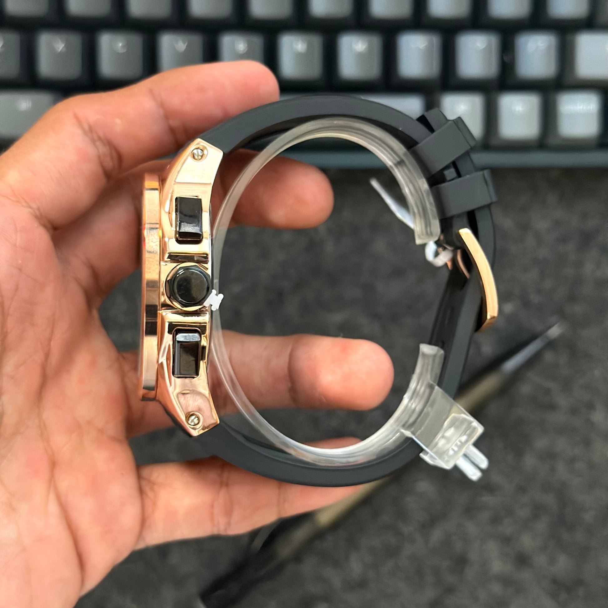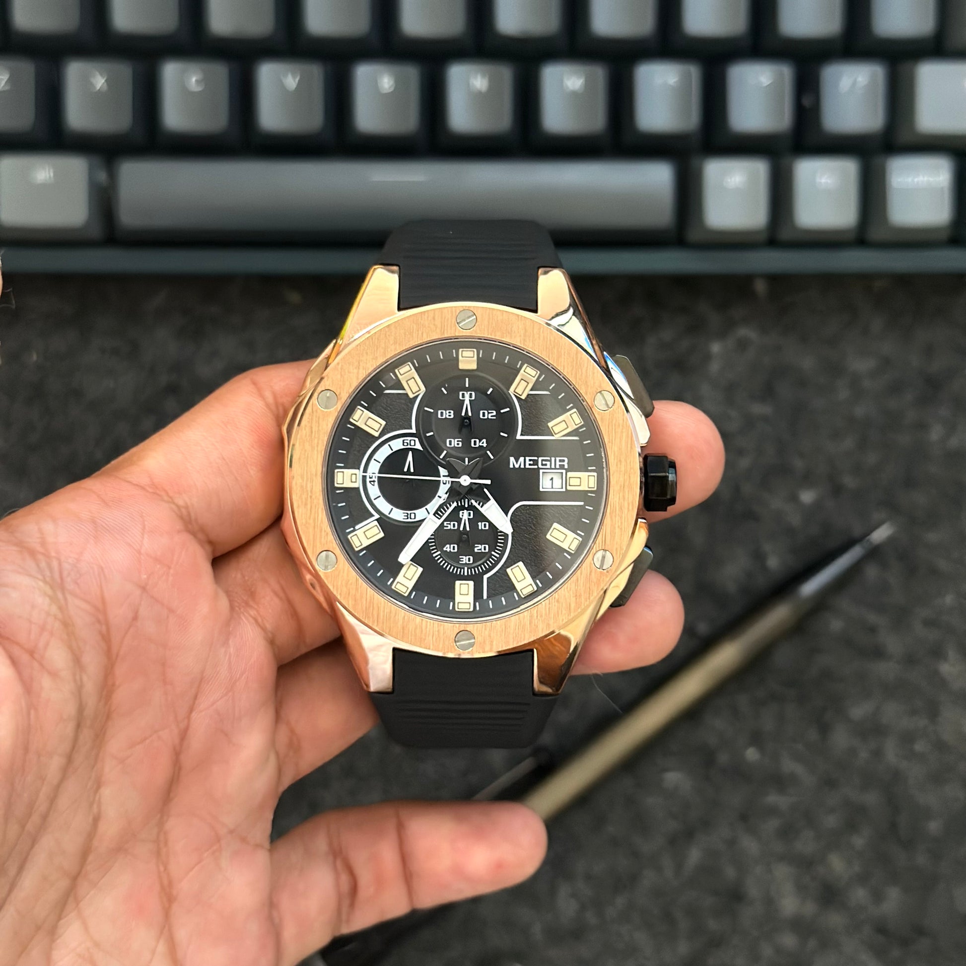 Diseñado para el hombre que no le teme a los desafíos. El Reloj Megir 2053 es una declaración de fuerza y precisión, con una estética robusta inspirada en los relojes de aviador de alto rendimiento. Su imponente caja de acero en tono oro rosa y su detallada esfera con cronógrafos funcionales se asientan sobre una cómoda correa de silicona, creando un equilibrio perfecto entre potencia y confort. Es el reloj ideal para el hombre que vive su vida con audacia y exige lo máximo de sus accesorios.
