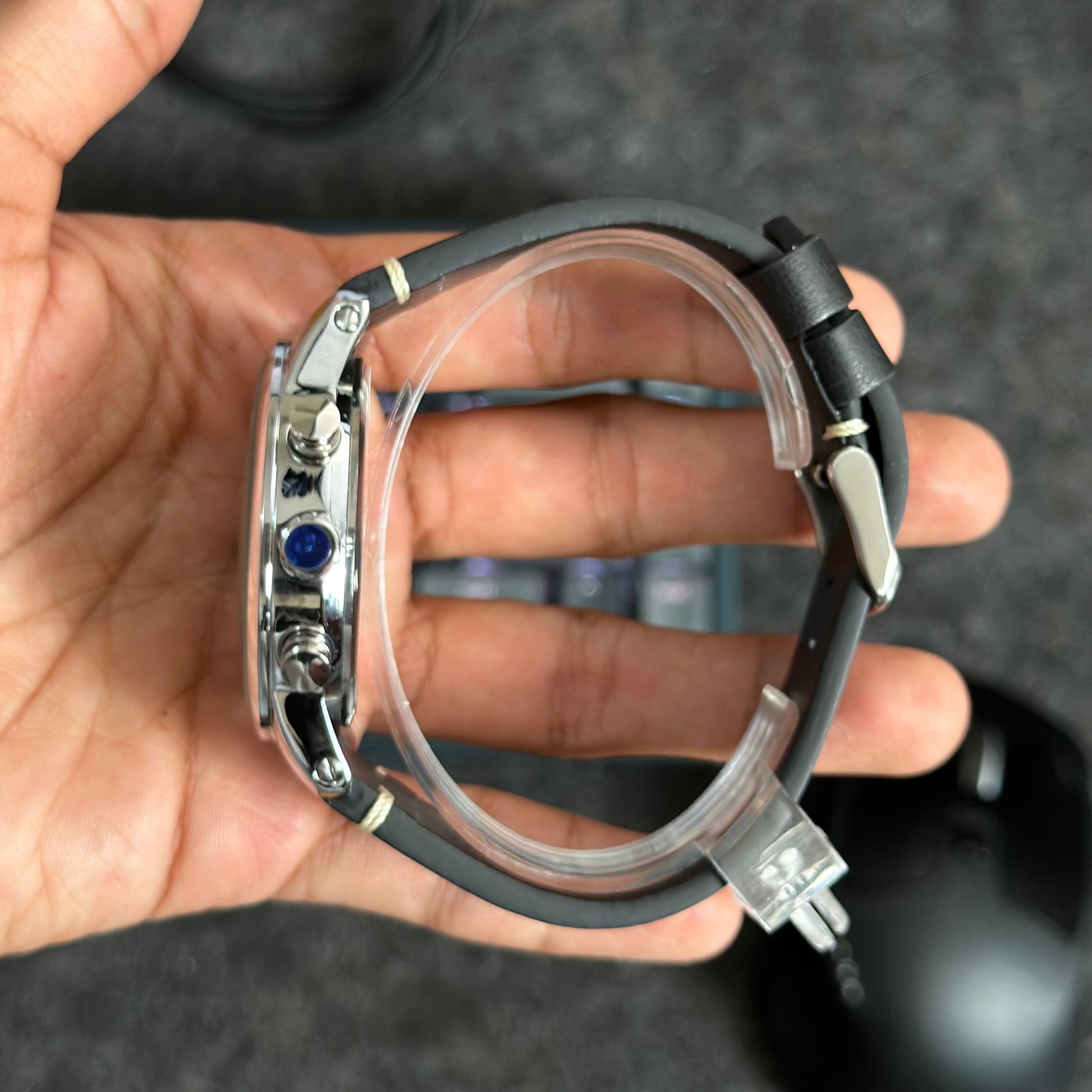 Su esfera detallada, con tres sub-diales funcionales y una escala de taquímetro en el bisel, proyecta una imagen de precisión y sofisticación. La cómoda correa de cuero genuino con costuras de acento asegura un ajuste perfecto y añade un toque de calidez y distinción a su robusta caja de aleación.